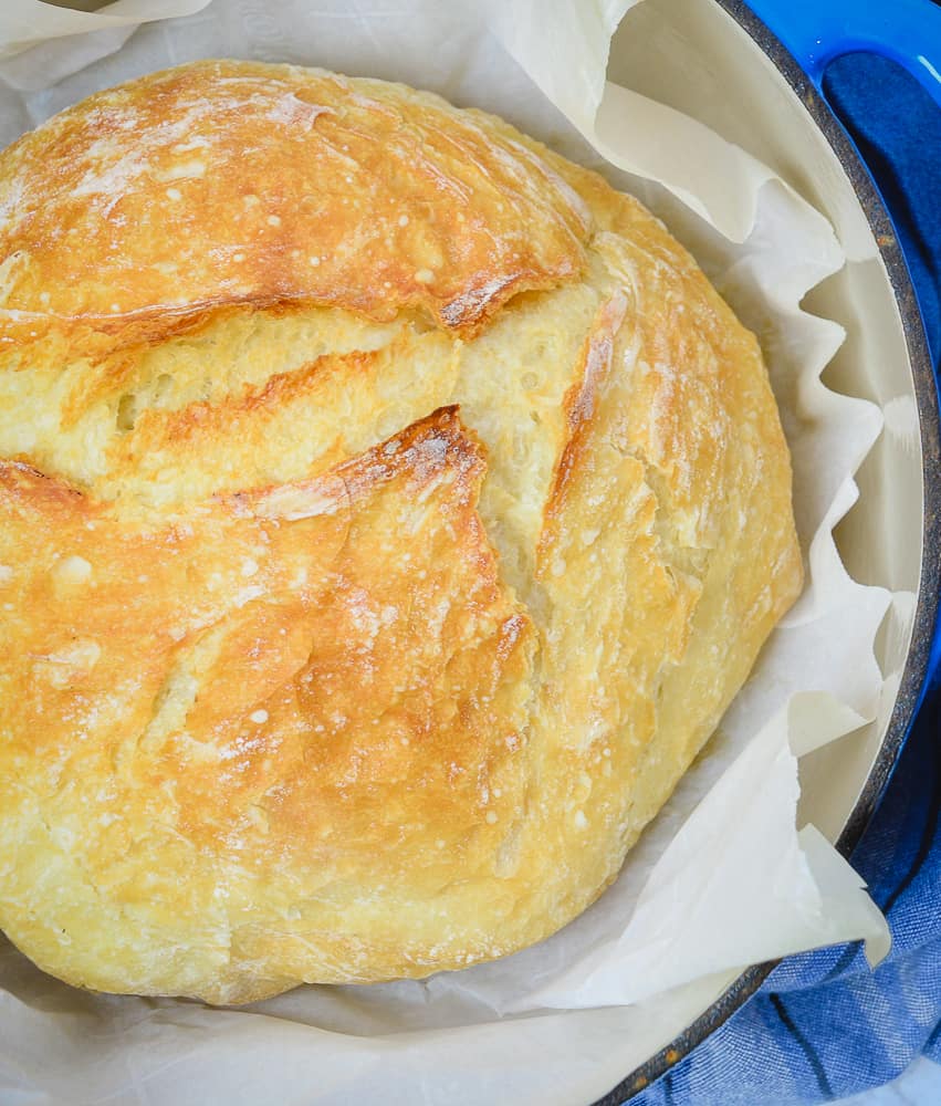 This quick and easy yeast bread requires no kneading! Baking in a Dutch oven is what gives this loaf a beautiful crusty exterior and deliciously soft and chewy interior.