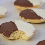 Halfmoon cookies are frosted on the flat side, or bottom of the cookie. Spread vanilla frosting onto half of the cookies on the flat side. Spread the chocolate icing onto the other side.